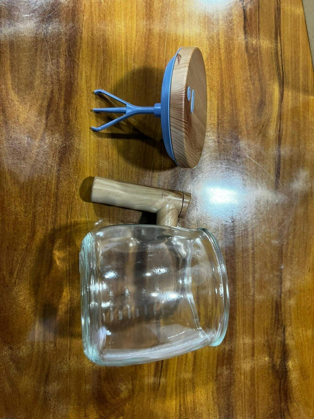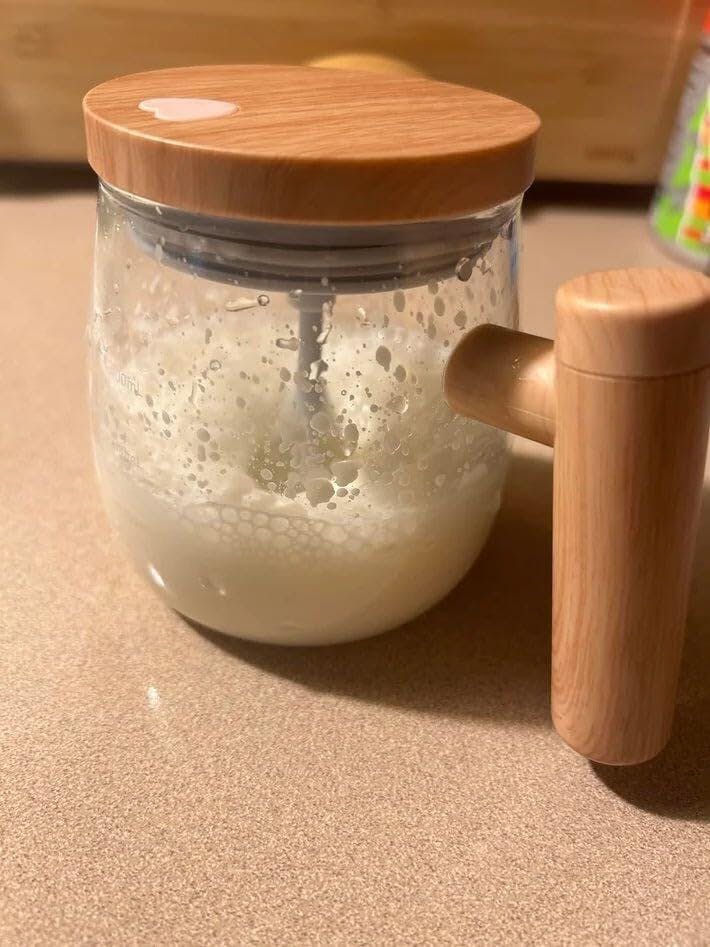 Crafted with a transparent borosilicate glass body, a natural wood-grain handle & lid, and a built-in frother — it makes mixing coffee, milk, or protein powder effortless.